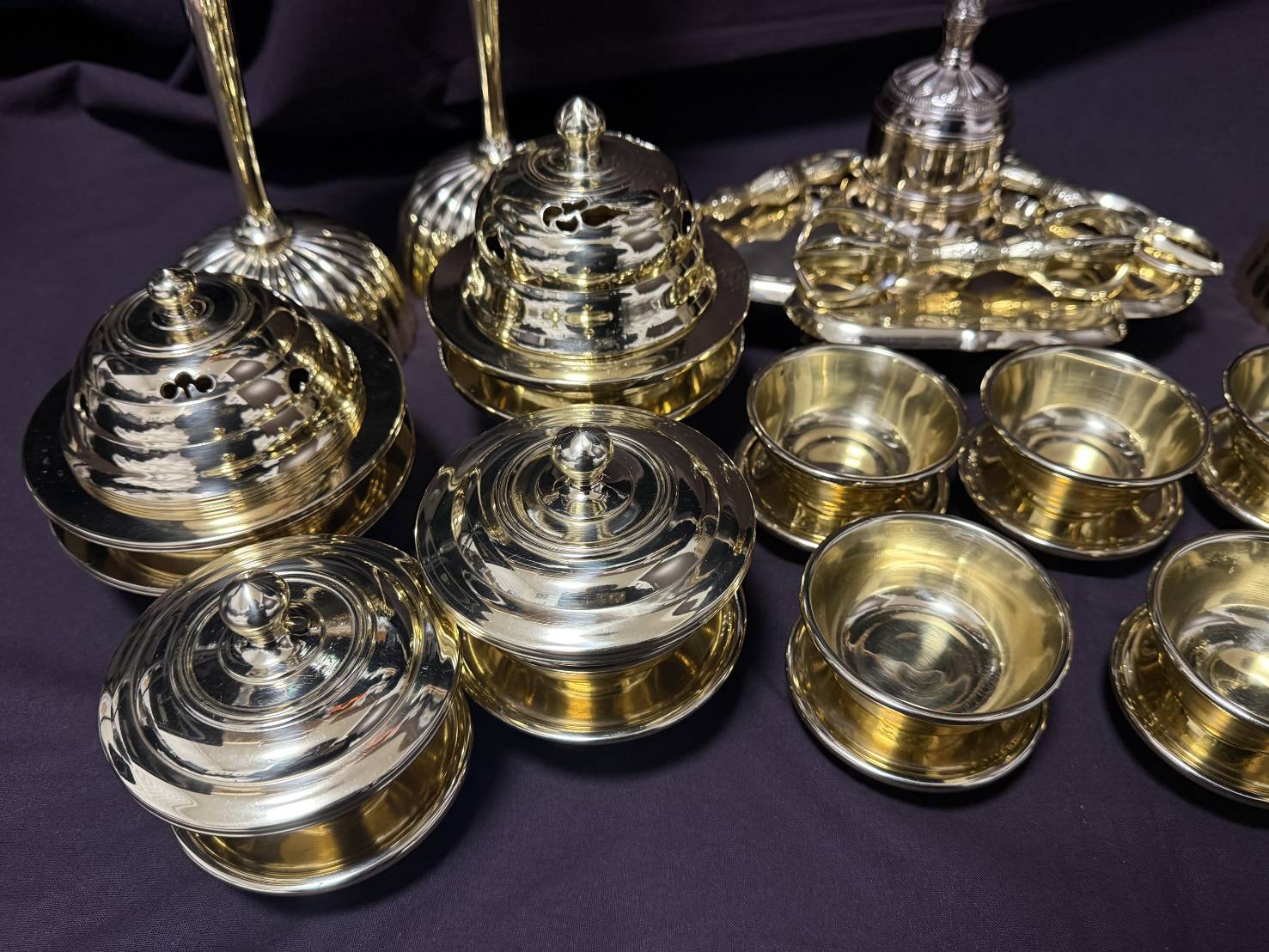 緑青(サビ)や汚れなどが出ておりました、前具一面器、菊壇灯をお預りし、加工させていただきました。